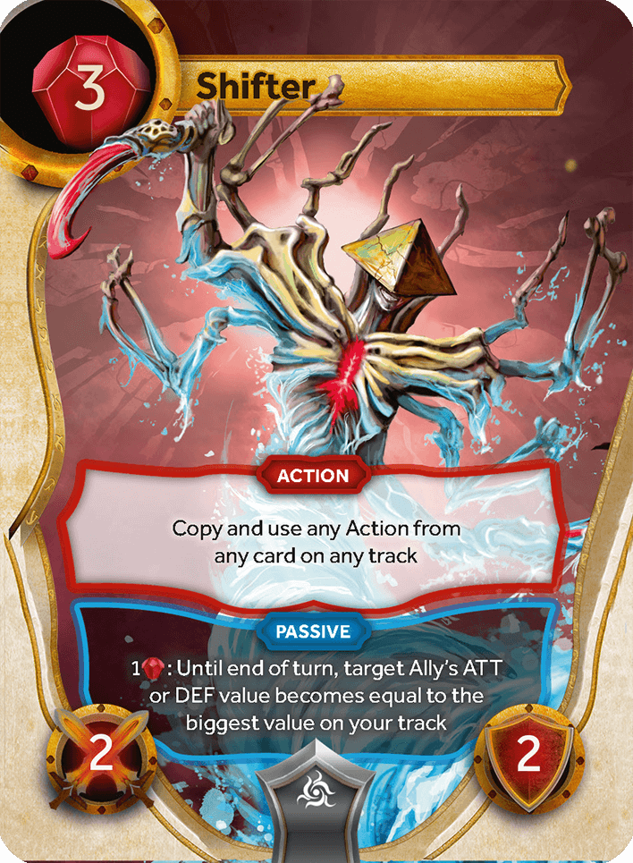 #1: Until end of turn, target Ally's ATT or DEF value becomes equal to the biggest value on your track