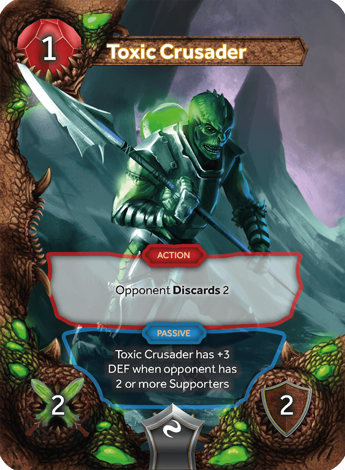 Toxic Crusader has +3 DEF when opponent has 2 or more Supporters